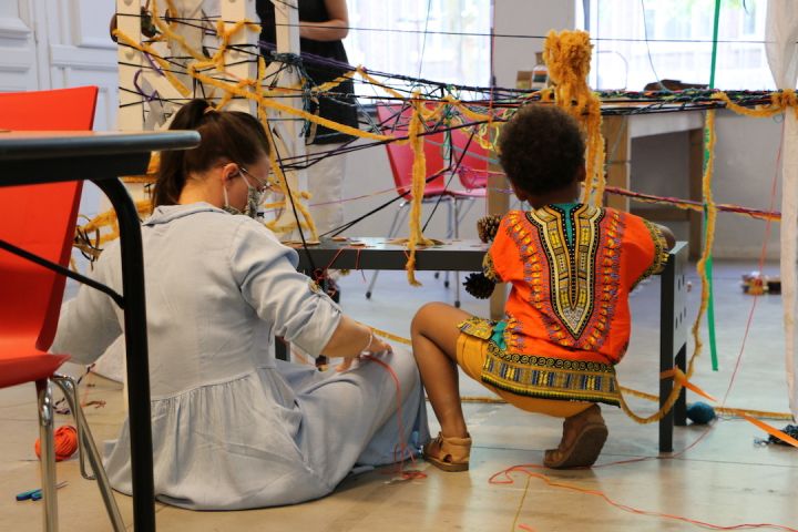 L'après-midi, les enfants découvrent les arts plastiques par l'exploration d'un atelier éphémère où se rencontrent couleurs et matières. À leur rythme, ils profitent d'un espace qui leur est entièrement dédié. Pour les accompagnants, c'est aussi l'occasion de partager un moment privilégié, d'oublier le temps ou, justement, de le prendre.