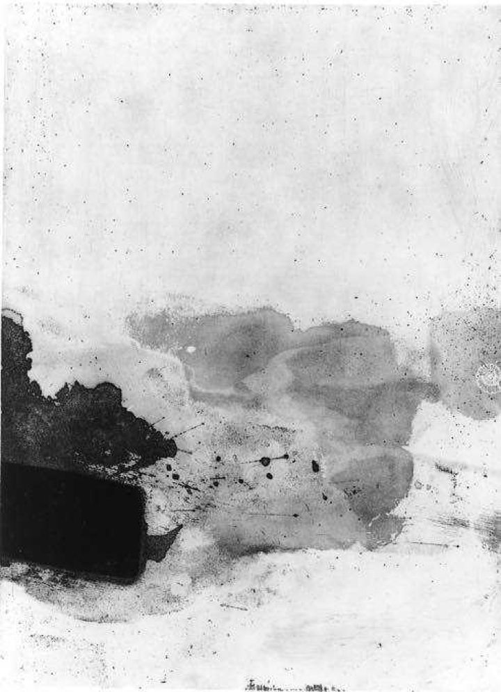 Développement dans l'espace, 1989Dans la série Développement dans l’espace (1989), Gabriel Belgeonne retrouve une liberté gestuelle qu’il avait abandonnée à la fin des années 60. Utilisant une encre dans les tons vert-brun, le mouvement paraît plus souple car la couleur employée atténue les contrastes.