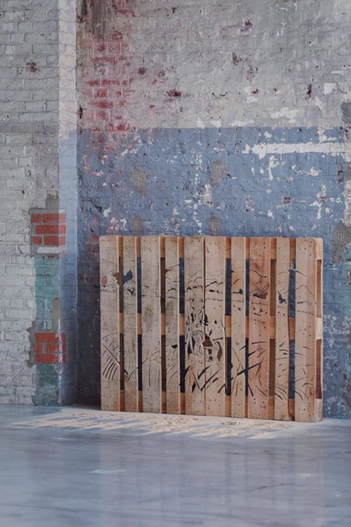 Estibas, 2017Cette installation revient sur les conflits qui ont duré plus de 60 ans, en Colombie, et qui ont engendré un profond écart entre la réalité urbaine et la réalité rurale, ainsi qu'aux conséquences de l'abandon des territoires agricoles et de leurs habitants par les gouvernements successifs. Pour évoquer ces conflits, Avila Forero décide de présenter des images gravées sur des palettes, supports destinés au transport de marchandises. Les personnages représentés sont inspirés des épisodes-clés du conflit armé en Colombie et de gravures de l'époque coloniale. L'artiste inscrit une nouvelle mémoire sur cet objet prosaïque, éminemment commercial, en convertissant ce qui était un moyen de transport en objet porteur d'une histoire spécifique, celle du pillage. Devant chaque palette, la sciure de bois, reliquat de la gravure, reproduit, en positif, la même image qui se réfère à cette situation historique et politique qui a transformé les paysans en guérilleros.