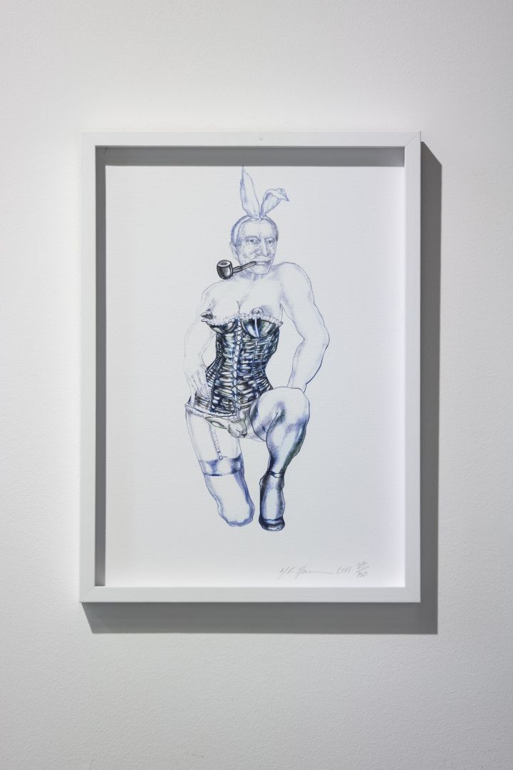 He's only a Bunny Boy but He is quite nice really, 2009Harrison utilise, depuis les débuts de sa pratique, des figures issues de l'iconographie populaire pour soulever une réflexion autour des codes associés au genre, inversant avec humour les rôles traditionnels. On retrouve ces caractéristiques dans son portrait du fondateur du magazine Playboy, Hugh Hefner, en Bunny Boy. Le dessin est stylisé comme s'il posait pour son propre magazine qui incarne, dans les années 1960, une nouvelle utopie érotique populaire. Reprenant une posture soi-disant séductrice; avec la jambe en avant, les tétons sortant du corset, contrastant avec sa pipe fermement coincée entre les dents, cette figure de Hugh Hefner convoque une réflexion sur le statut des femmes affublées d'oreilles de lapin, qu'il a lui-même imaginées.