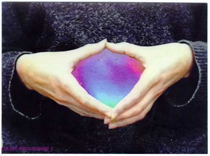 Provisory object 1, 1997Edith Dekyndt observe et met en exergue des processus du quotidien, des phénomènes physiques, par le biais d’une esthétique minimaliste. Elle révèle poétiquement à notre regard ce qui est à peine perceptible. Provisory Object 1 fait partie d’une série de trois œuvres où de l’eau savonneuse est maintenue dans le creux de l’espace formé par des mains et dont l’aspect varie en fonction des conditions météorologiques.