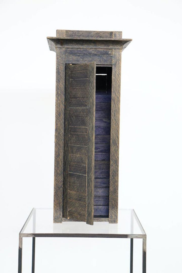 Sans titre, Sans dateArtiste protéiforme, plus connu encore pour son théâtre, Jan Fabre livre une petite sculpture empreinte de mystère. Dans cette guérite miniature, un escalier ne mène nulle part. Ni les proportions, ni les formes n’aident à comprendre: l’œuvre s’ouvre sur une énigme que le caractère obsessionnel du recouvrement de la surface au Bic accentue encore.
